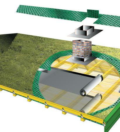 Layers of a green roof including waterproofing, drainage, and vegetation