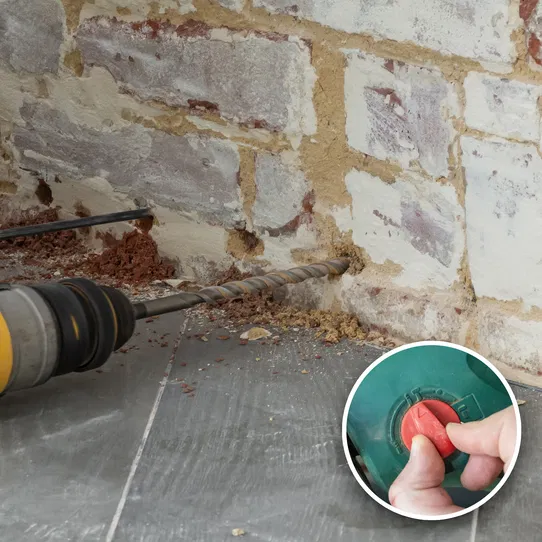 Set your SDS drill to rotary hammer mode and attach the suitably marked drill bit. Identify the lowest horizontal mortar course that is accessible and continuous and at least 150 mm above the outside ground level. Drill holes to the full recommended depth, at regular 120 mm intervals along the wall. As the drill bit approaches the final 40 mm of the intended hole depth, make sure to reduce the pressure to avoid damage to the far side of the wall.
